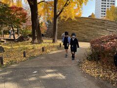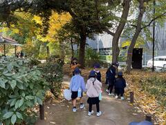 見学の途中では、落ちている葉っぱや木の実を拾いながら、秋ならではの発見を楽しむ姿が見られました。これから、拾った葉や木の実を使って秋遊びをしていきます。