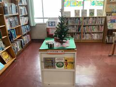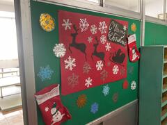 また、図書室の中や周囲には、「図書ボランティア」の皆様によるクリスマスにちなんだ本の紹介や掲示物が飾られ、
