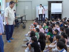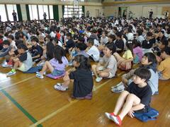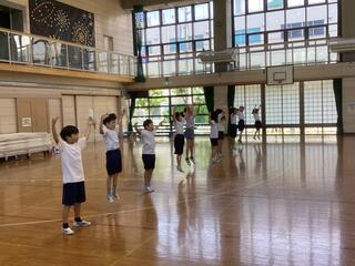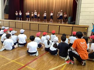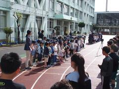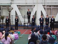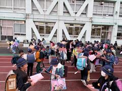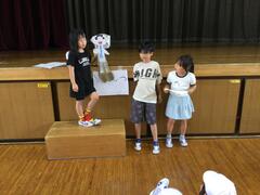 1年生が初めて全校朝会に参加するので、2年生から6年生に