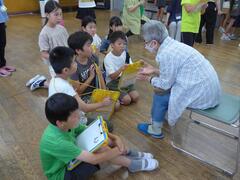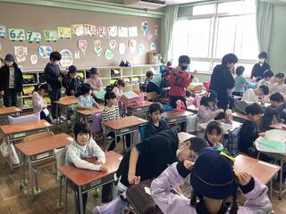 Today, the first graders came to the classroom for the first time. The sixth graders were helping them with their morning preparations. Afterwards, the sixth graders read picture books to the first graders.