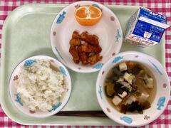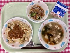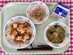 今日はご飯の上にたっぷりのマーボー豆腐がのっています。ご飯もたっぷりありましたが、マーボー豆腐もたくさんあったのでどのクラスもどちらも食缶は空っぽでした。マイルドな味付けなので1年生も安心して食べられる味です。めかぶたっぷりの汁物はだしのきいた優しい味わいで、寒い日にぴったりです。