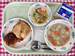 今日はパンの間に具をたっぷり詰めてチーズをのせて焼きました。大豆を細かくしたものやピーマンも入っていますが、ピザの味付けなので、大人気でした。学級閉鎖で余ってしまったパンもたくさん食べてくれました!グリーンサラダは練りごまを使用したドレッシングで、とても人気があります。