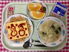 今日は2025年最後の給食でした。最後はケチャップでお絵描きができるオムライスです。皆さんそれぞれ思い思いの絵をかいて楽しんでいました。最後の給食は華やかにと思い、2種類の果物を用意しました。スイートスプリングがたくさんあり、ボリュームがありましたが皆さん残らないように一生懸命食べてくれていました!
