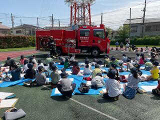 1、2年生で「消防写生会」を行いました。近くで消防車や消防士さんを見られて、子供たちは大喜びでした。クレパスを使い、画用紙いっぱいに消防車を描くことができました。