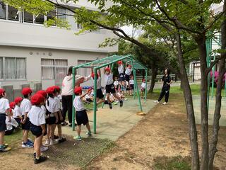体育の時間に、わんぱく広場の遊具を使って遊びました。うんていや登り棒は得意不得意があるようですが、みんな楽しそうに取り組んでいました。