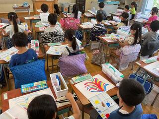 図工の学習で初めて絵の具を使いました。用具の準備や片付け、使い方について学びました。子供たちは、少しずつ筆の使い方に慣れ、いろいろな色で画用紙に線を描くことができました。