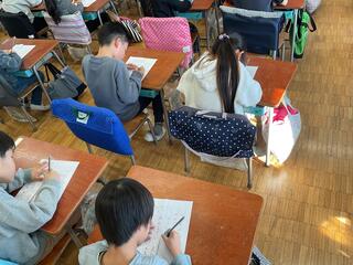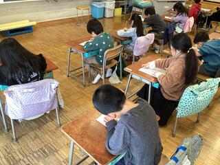 初めての硬筆の書き初めに真剣に取り組みました。正しい姿勢、正しい鉛筆の持ち方を意識しながら一画一画丁寧に書こうとする姿が見られました。本番では、練習の成果が発揮され、手本と同じように書けたことを喜ぶ児童の姿もありました。新年のスタートにふさわしい、書き初めの時間となりました。