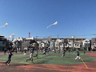 生活科『ふゆであそぼう』の学習で、凧揚げをしました。隅田小学校の校庭が使えないため、旧隅田小学校の校庭で凧揚げをしました。