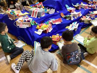 展覧会の作品鑑賞をしました。子供たちは体育館に入ると、「わぁ、すごい。」と感嘆の声をあげていました。目を輝かせながら夢中で作品を見ている姿が微笑ましかったです。