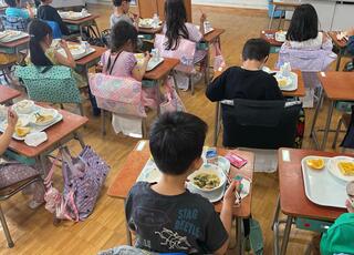 給食当番が盛り付けを行い、皆で給食の準備をしています。味わいながら、集中して食べています。「今日もおいしかったです!」と伝えてくれる児童がたくさんいます。苦手なものも残さず食べようとチャレンジする姿が見られます。もりもり給食を食べて、どんどん成長していってほしいと思います。