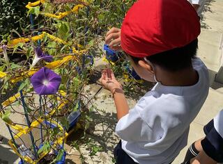 生活科の授業でアサガオを育てています。5月に種を植えてから、芽や葉の観察を行いました。すくすく成長するアサガオの様子を見て、喜びを分かち合う児童の姿があります。愛情をもって関わり、毎日欠かさず水やりをする姿は大変素晴らしいです。「どんな花が咲くのかな。」とこれからの成長を楽しみにしています。