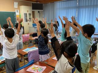 音楽では、鍵盤ハーモニカや音階の学習をしています。「どれみにあわせてからだをうごかそう」の学習では、「ドレミファソラシド」の音の高さを、腕を動かして表現しました。音には種類があって、高さが違うことを全身で感じ取ることができました。