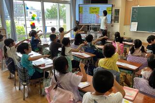 国語の学習では、ひらがなを書く練習をしています。手本をよく見て、とめ、はね、はらいを意識して丁寧に書いています。新しいことを勉強する楽しさを皆で味わいながら学習をすすめています。