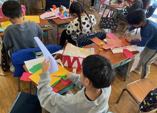 始めての展覧会に向けて、作品を作っています。『おしゃれなさかな』では、紙袋に色紙を貼り付け、思い思いの形や色を組み合わせることで、個性あふれる魚たちが完成しました。他にも、子供たちが夢中になって作り上げた作品が展示されます。展覧会でぜひご覧ください。