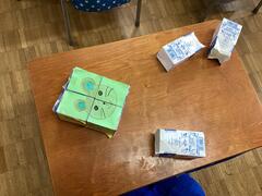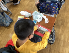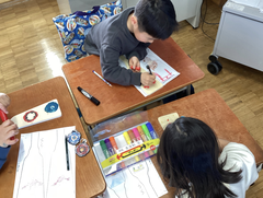 牛乳やジュースの空箱を使って「からくりばこ」を作りました。二つの空き箱を組み合わせて、2種類の絵が交互に現れる仕組みになっています。子供たち同士で「どんな組み合わせが面白いかな?」と話し合いながら意欲的に取り組んでいました。