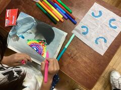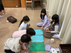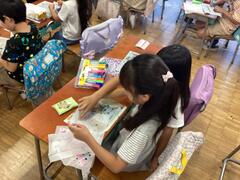 図工の授業でティッシュを使った模様作りの学習を行いました。ティッシュを折りたたみカラーペンで線や点を書いて広げると不思議な模様が浮かび上がりました。子供たちは「花火みたい!」「電車が繋がっているみたいだよ」と浮かび上がった模様を見ながら、想像を膨らませて楽しく図工の時間を過ごしました。