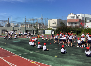 1年生と合同でダンスを踊りながら玉入れをします。今年は映画スティッチの「アロハ・エ・コモ・マイ」の音楽に合わせてダンスを踊りながら玉入れをします。オハナ(家族のような深い絆や心のつながり)の気持ちで心を合わせて頑張ります。