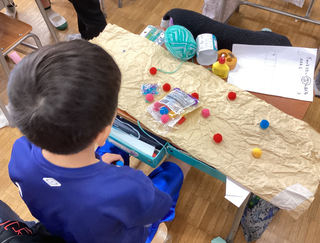 生活科の学習で作ったおもちゃで遊びました。試行錯誤をしながら、レベルアップしたおもちゃを友達に紹介しながら遊びました。