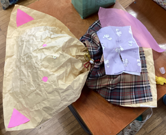 紙袋や布の端切れ、モールなど様々な道具を使いながら人形つくりをしています。