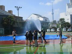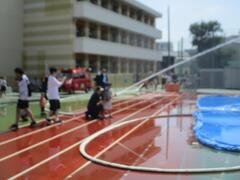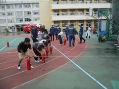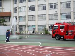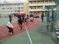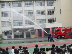 今日の避難訓練は、火災を想定した避難訓練でした。子供たちは「お・か・し・も」を守って避難することができました。今日は向島消防署と地域の消防団の方々が来て総合防災訓練として放水訓練と消火器による消火訓練も行いました。