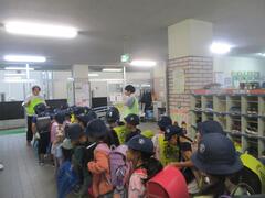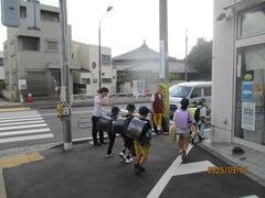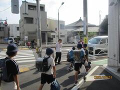 今日は1年生が交通安全教室を行いました。区の交通安全指導員さんが来て横断歩道の渡り方などを教えていただきました。実際に横断歩道を渡る練習をしました。