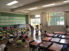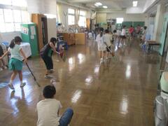 今日も気温が高くなり、昼休みは校庭で遊べず内遊びをしました。学校図書館や教室で過ごしました。今日はA時程なのでお掃除がありました。低学年の掃除には、高学年がお手伝いをしてくれています。