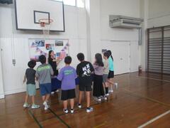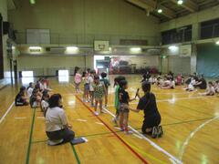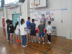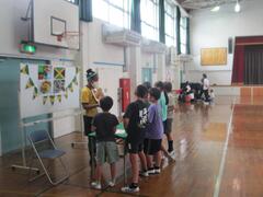 体育では体力テストを行っています。今日は体育館で低学年がシャトルランを行っていました。高学年のお兄さん、お姉さんが記録の補助をしてくれていました。