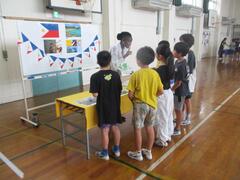 今日は、英語の授業で、アメリカやイギリス、ジャマイカ、フィリピンの国のネイティブの先生たちが来て、英語やその国の文化について触れる機会をもちました。それぞれのブースに分かれて、ネイティブの先生たちと英語で交流をしました。
