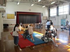 4年生は総合の時間で「共に生きる」の学習を行っています。今日は、研究授業で4年生の子供たちの学習の様子を先生方に見てもらいました。車椅子体験や白杖を使って歩く体験も行いました。