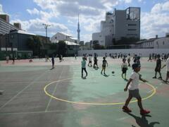 今日は八広小の体育館でキンボール体験教室がありました。指導員の方にルールを教えてもらい、大きなボール(キンボール)を使ってゲームをしました。八広小の子供たちもたくさん参加しました。