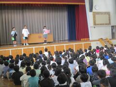 今朝の児童集会は、保健委員会と給食委員会の発表がありました。保健委員会の発表では石けんで手を洗うことの大切さなど分かりやすく説明してくれました。給食委員会の発表では、リクエスト給食の紹介がありました。リクエストしたい給食に投票しました。